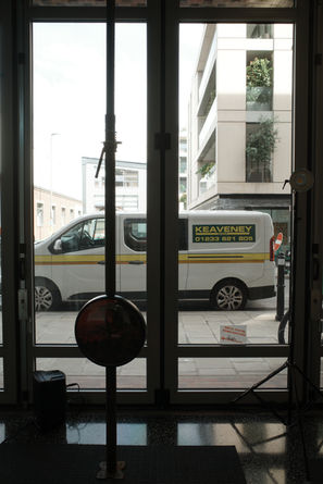 H. M. Baker’s "BIG TIME" (2024) is presented across from a running clock, both mounted on poles connecting the floor to mezzanine ceiling, while carpet tiles sourced from Martin's Bank create a path between them in a new iteration of her past work titled "BIG SLEEP" (2024) presented in the Hangar Space at the Royal College of Art, exploring performative productivity within labour practices. The film alternates between rehearsal and final-cut footage in an office setting, interrogating the cyclical demands of corporate performance.